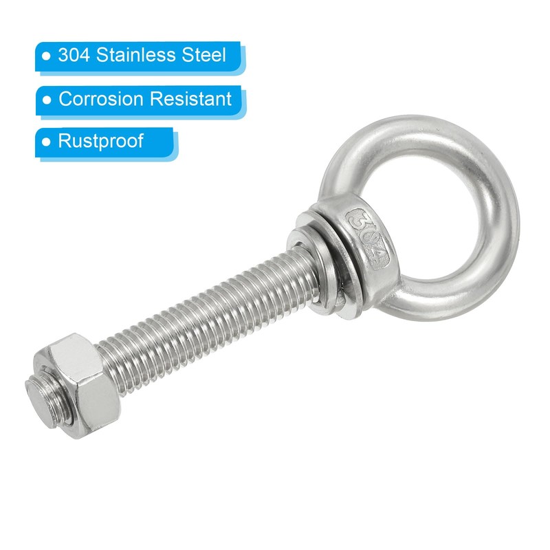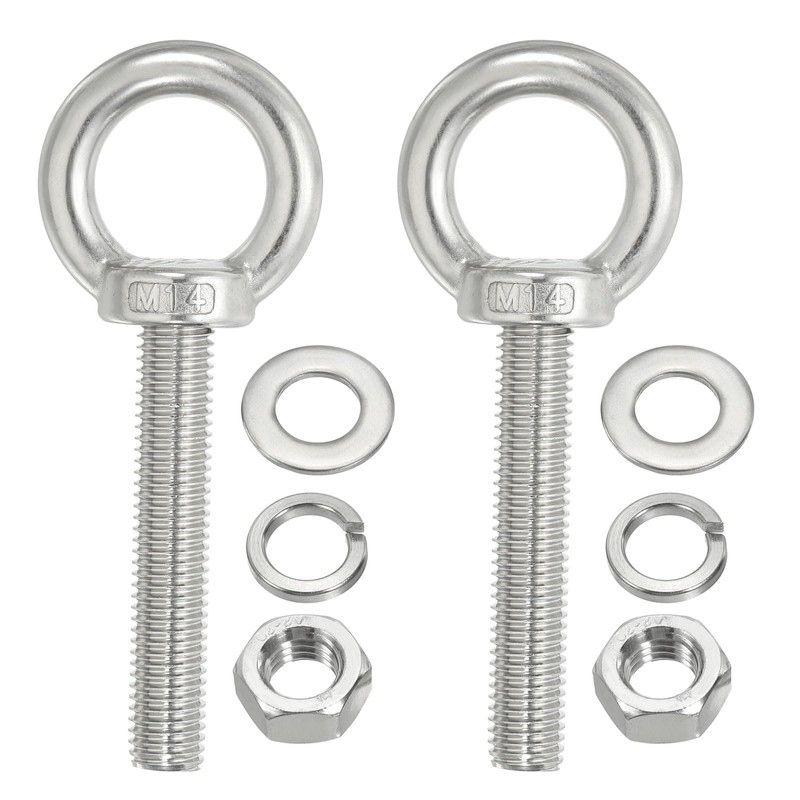 - Material: Stainless Steel; Thread Size: M14 x 80mm; Ring Inner Diameter: 30mm / 1.18"; Package List: 2 Thread Eye Bolts with Lifting Ring (With Nut Gasket, Flat Washer, and Opening Washer)