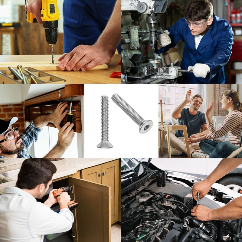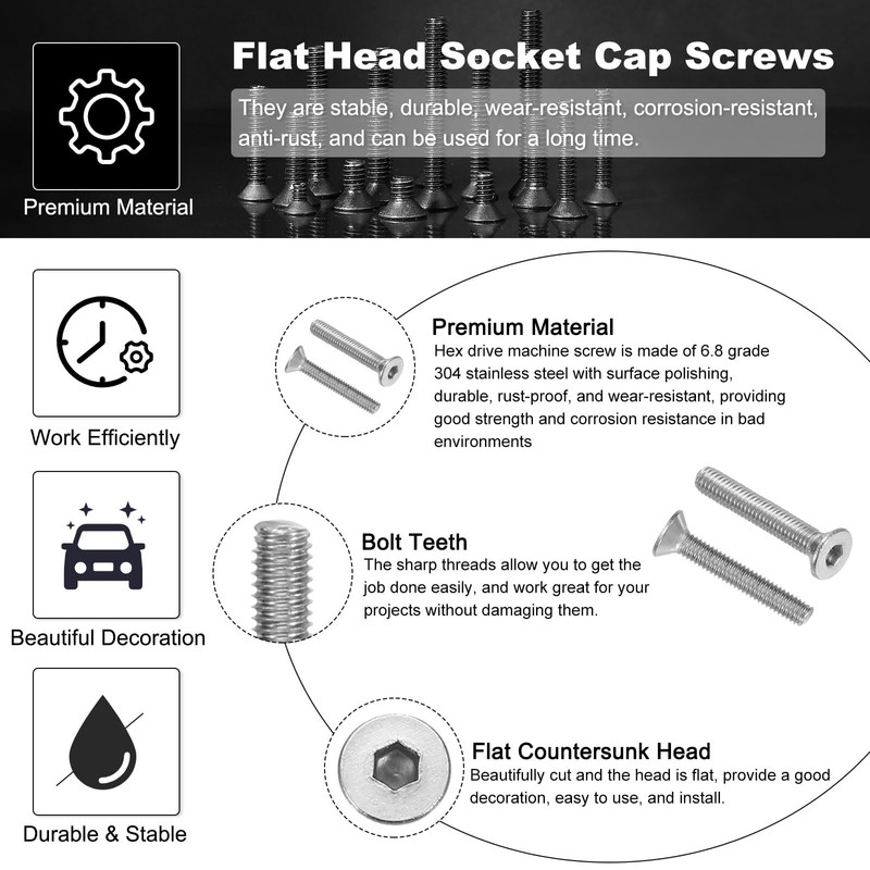 - Good Stability & Beautifully Surface: Hex drive countersunk bolts with clear threads, provide stability and can be used for a long time. Beautifully cut and the head is flat. provide a good decoration, easy to use and install
