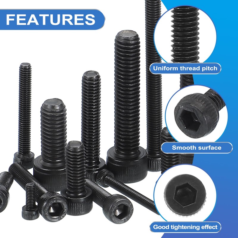 Socket head screws are made of 12.9 grade carbon steel, with good anti-rust performance and durability. The standard hexagon socket has uniform force, a good fastening effect, is not easy to deform and slide during installation, and can withstand large loads; the thread is deep, the pitch is uniform, the surface is smooth, and there are no burrs.