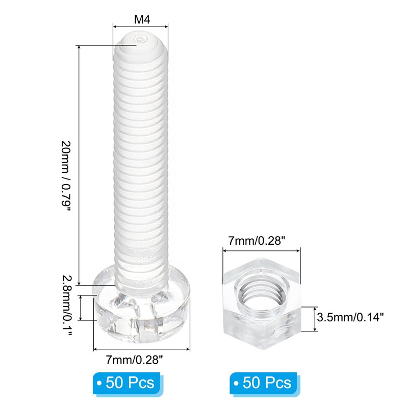 - Material: PC, Acrylic; Screw Head Style: Phillips Round Head; Thread Size: M4; Thread Length: 20mm / 0.79"; Pitch: 0.7mm / 0.03"; Screw Head Size: 7 x 2.8mm / 0.28 x 0.11 inch (Dia*Thi); Hex Nuts Size: 7 x 3.5mm / 0.28 x 0.14 inch (W*Thi); Package Content: 50 Set x Plastic Screws with Nuts