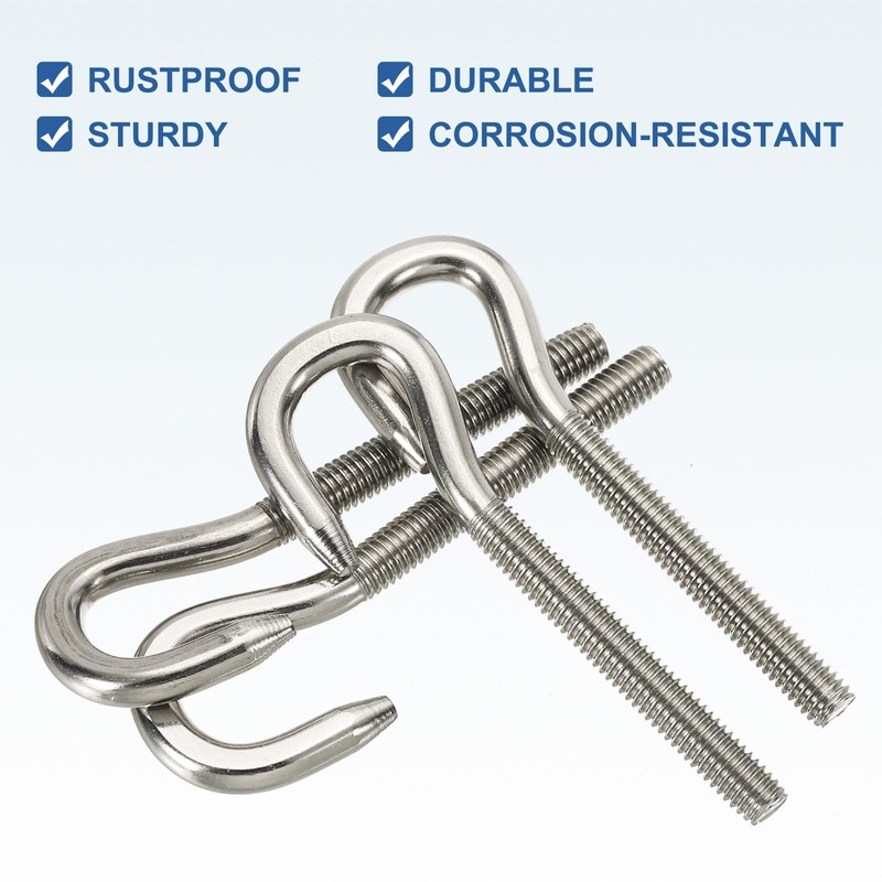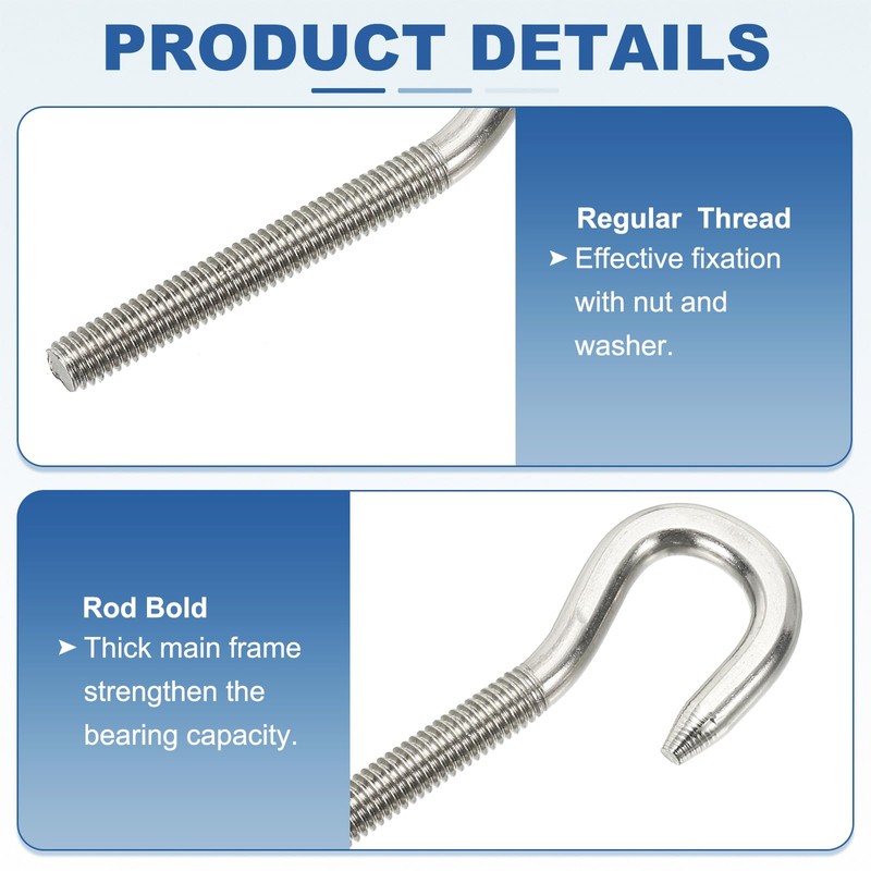 - Advantage: Hook bolts are made of 304 stainless steel, ensuring durability and wear resistance. The thread is deep and clear with uniform pitch, so it is tight and not easy to slip when used, and it can remain firm in any environment.