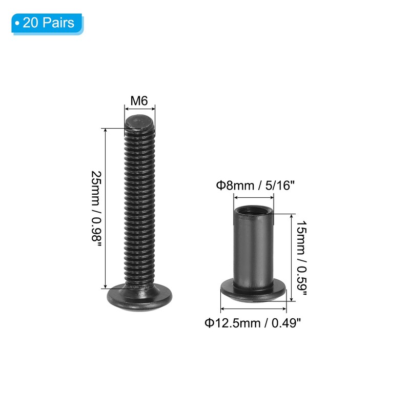 - Thread Size: M6 x 25 mm; Threaded Hole Diameter: 6 mm / 0.24 inch; Fit for 5/16" (8mm) Hole Dia; Thread Pitch: 1 mm / 0.04 inch; Socket Size: 15 x 8 mm / 0.59 x 0.31 inch (L*OD); Content: 20 Set x Screw Post