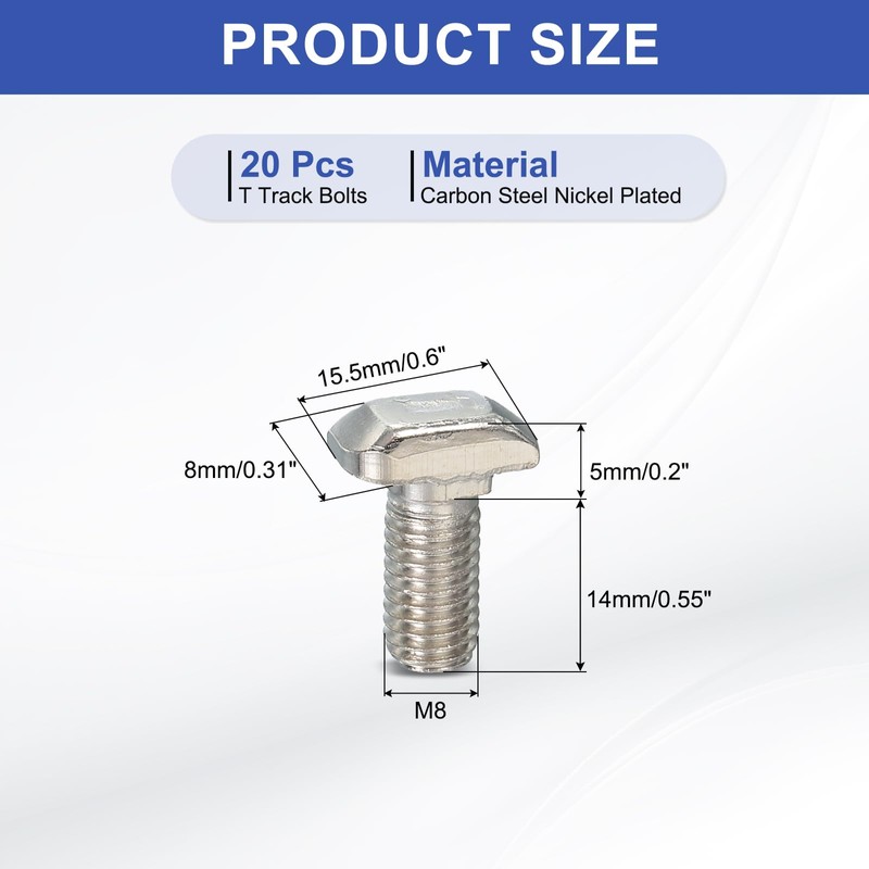 - Material: Carbon Steel Nickel Plated; Thread Diameter: M8; Thread Length: 14 mm / 0.55 Inch; Head Size: 15.5 x 8 x 5 mm / 0.6 x 0.31 x 0.2 Inch (L*W*THK); Step Size: 2 x 8 mm / 0.08 x 0.31 Inch (H*W); Packing List: 20 Pcs x T-Slot Bolts