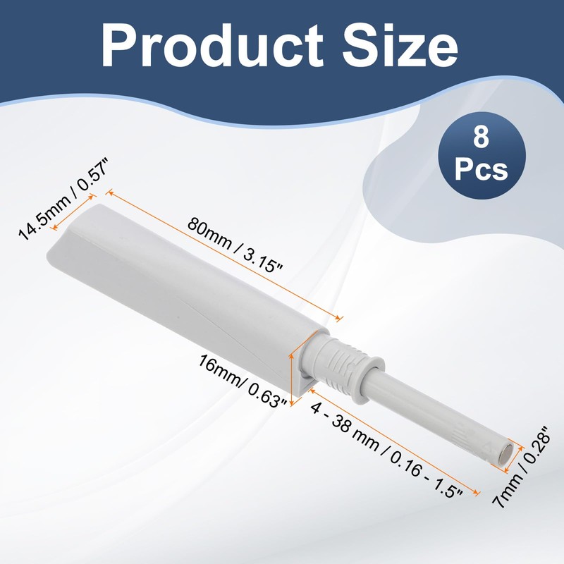 - Color: Gray; Total Size: 80 x 14.5 x 16 mm / 3.15 x 0.57 x 0.63 inch (LxWxH); Diameter: 7 mm / 0.28 inch; Fine-Tunable Distance: ; Extended Length: 4 - 38 mm / 0.16 - 1.5 inch; Packing List: 8 Pcs x Push Latches; 8 Pcs x 3 M Iron Sheet, 24 Pcs x Screws