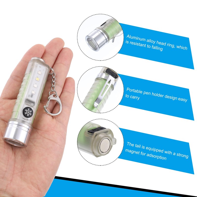 • Advantage: 1. The flashlight shell is IPX4 waterproof, suitable for rainy days, indoor or outdoor use. Comes with a metal clip and keychain that can be clipped to your backpack to prevent the flashlight from accidentally falling. 2. The tail of the flashlight is designed with a magnet, which has strong adsorption force and can be used as a work light. 3. 50W LED wick, long range, clear lighting, and multiple light source modes suitable for lighting needs in multiple scenes.