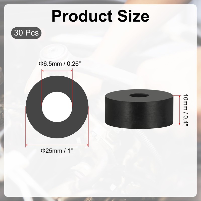 - Specification: Color: Black; Material: Rubber; Size: 6.5 x 25 x 10 mm/ 0.26 x 1 x 0.4 inch(ID*OD*T); Packing List: 30 Pcs x Multi Purpose Rubber Spacer