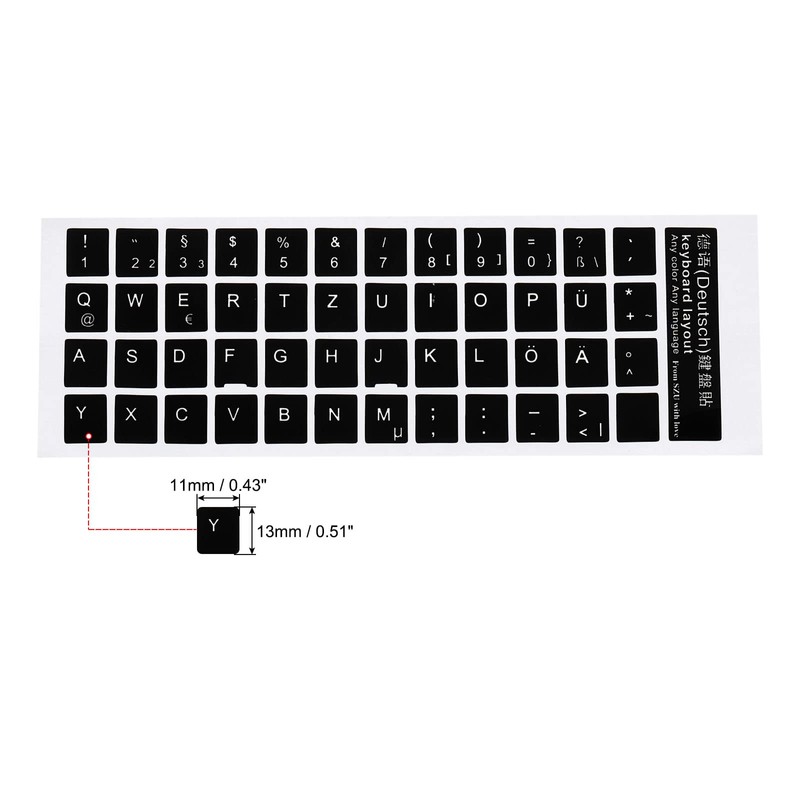 - Colour: Black, White; Material: PVC; Suitable for: Universal Keyboard; Single Keyboard Size: 11 x 13 mm / 0.43 x 0.51 inches (L x W); Total l Size: 180 x 65 mm / 7.09 x 2.56 inches (L x W); Package List: 2 x Keyboard Stickers