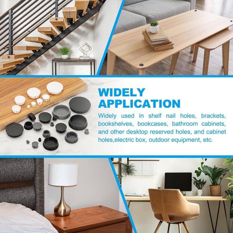 • Application: Plastic hole plugs are used to cover, hide, and decorate holes to keep the panel flat. Widely used in shelf nail holes, brackets, bookshelves, bookcases, bathroom cabinets, and other desktop reserved holes, and cabinet holes, electric box, outdoor equipment, etc.