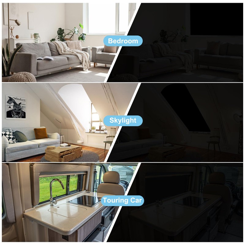 - Advantage: The portable blackout shades are made of thick and durable polyester material, with fine workmanship and a soft touch. Design with its full blackout shading rate provides excellent protection from the sun and harmful rays and protects your furniture and floors from the sun's exposure. Enjoy a completely dark sleeping environment to promote a comfortable sleep