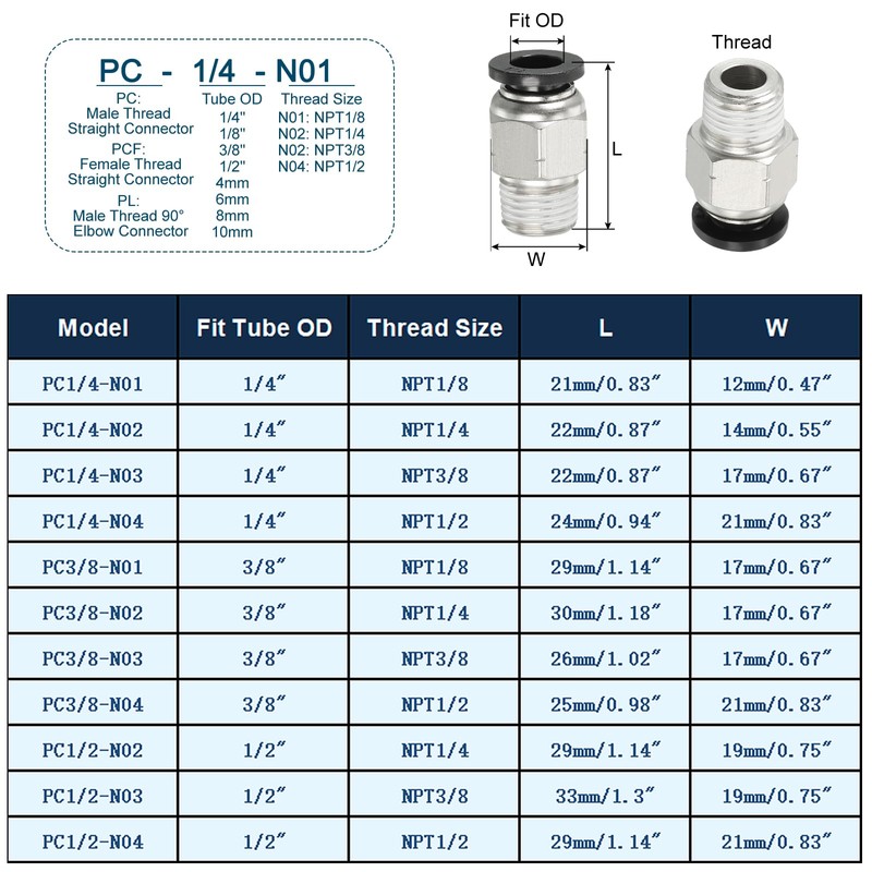 - Note: Correct installation is important to ensure optimal performance. Carefully match tube size and thread type with proper fitting. Regularly inspect fitting and replace as needed if there is signs of leakage