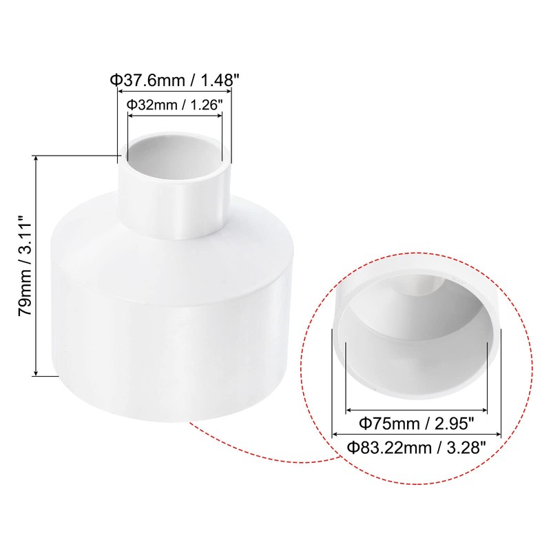 - Shape: Straight; Height: 79mm / 3.11 inch; Big Diameters: 83.22x75mm / 3.28x2.95 inch (OD*ID); Small Diameters: 37.6x32mm / 1.48x1.26 inch (OD*ID); Package Content: 1 x Reducer Fitting