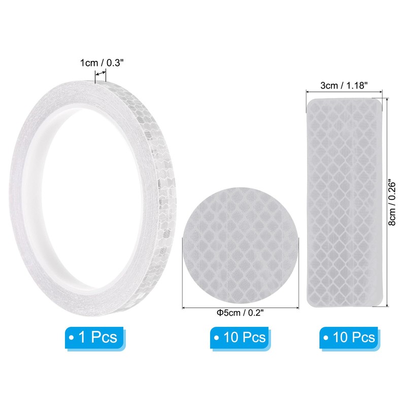 - Color: White. Material: PVC. Rolled Size: 1cm x 8 meter/ 0.3 inch x 26 FT (W x L). Rectangular Size: 8 x 8cm/ 3.14 inch x 0.26 FT (W x L ). Round Diameter: 5cm/ 1.96 inch. Packing List: 1 x Roll Reflective Tape, 10 x Rectangular Reflective Tape, 10 x Round Reflective Tape.