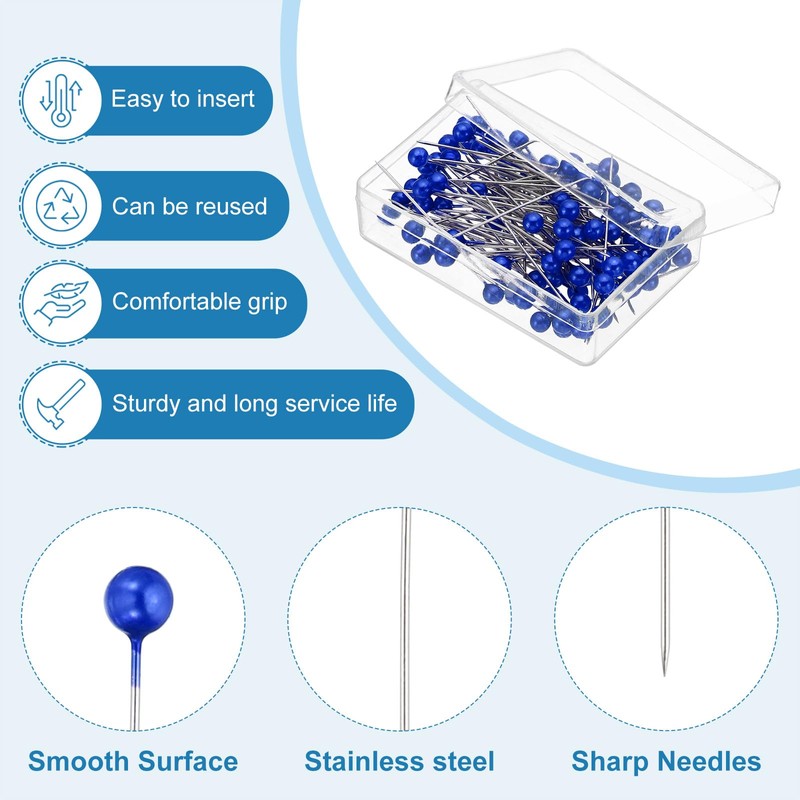 - Advantage: 1. The pearlized ball head pins are made of stainless steel, robust, smooth, and wear-resistant, anti-corrosion. The pearlized ball head design is easy to hold and use. 2. Quilting pins can be used to fix files or pictures on the wall or bulletin board or hang some light items or decorations. 3. The smooth surface of the sewing pins won't hurt your fabrics.