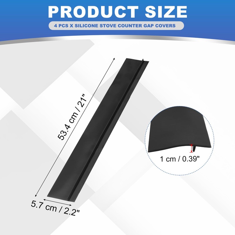 - Color: Black; Material: Silicone; Width: 5.7 cm / 2.2 inch; Thickness: 1 cm / 0.39 inch; Length: 53.4 cm / 21 inch; Packing List: 4 Pcs x Silicone Stove Counter Gap Covers