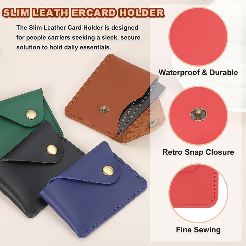 - Advantage: Crafted from leather, this card holder combining durability with vintage charm. The reinforced hand-stitching and rounded edges prevent fraying, ensuring longevity. The snap closure adds both security and elegance, while the slim profile maintains a lightweight, pocket-friendly design. Holds 4-6 cards and folded bills.
