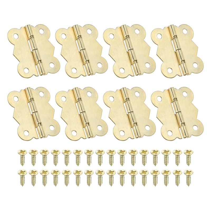 - Size: Color: Gold; Material: Metal; Size: 30 x 27mm / 1.2 x 1.1inch(L*W); Thicknesses: 0.6mm/0.02inch; Packing List: Small Butterfly Hinges x 8 + Screws x 32