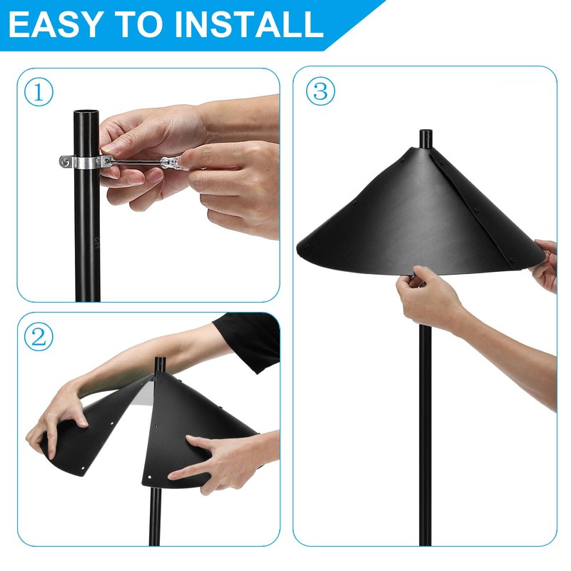 - Instruction: The Squirrel Stopper for Shepherd's Hook is designed with three easy-to-install plates and can be easily attached to bird feeder posts without additional tools.