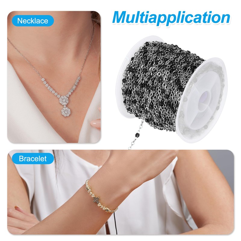 - Instruction: The beaded chain for jewelry making supplies is rolling on a reel to avoid messing or tangling, it is easy for you to cut any length you desire with a jewelry plier. When not in use, wrap it back around the reel and store it easily and conveniently.