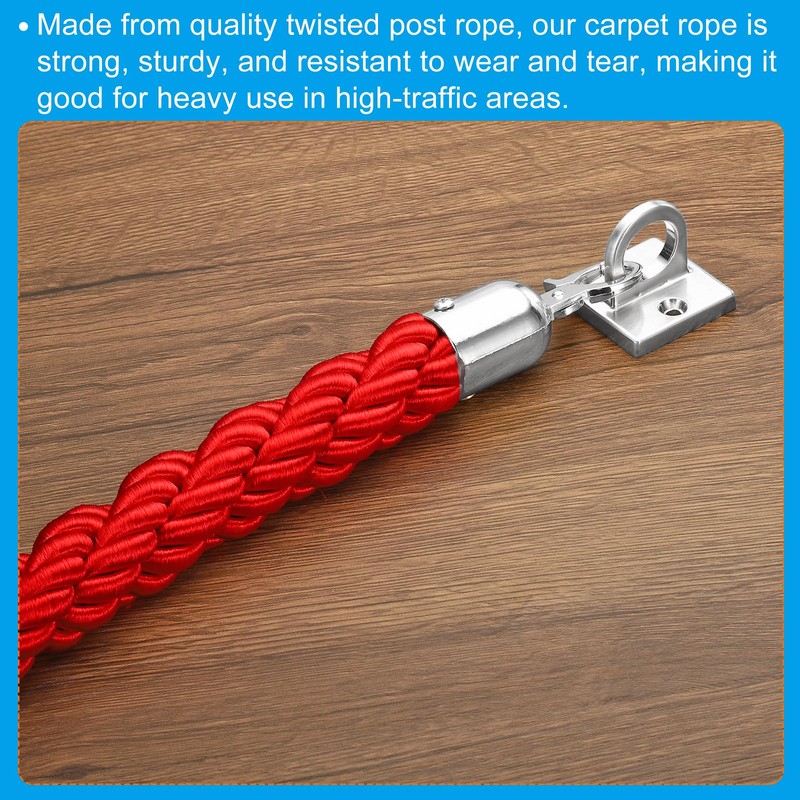 - Advantage: Made from quality twisted post rope, our carpet rope is strong, sturdy, and resistant to wear and tear, making it good for heavy use in high-traffic areas. The classic twisted post rope design gives a stylish and professional look, making it great for upscale events, VIP areas, and any setting where beauty matters. Our stanchion rope can be easily adjusted to fit your specific needs by adding or removing segments as necessary.