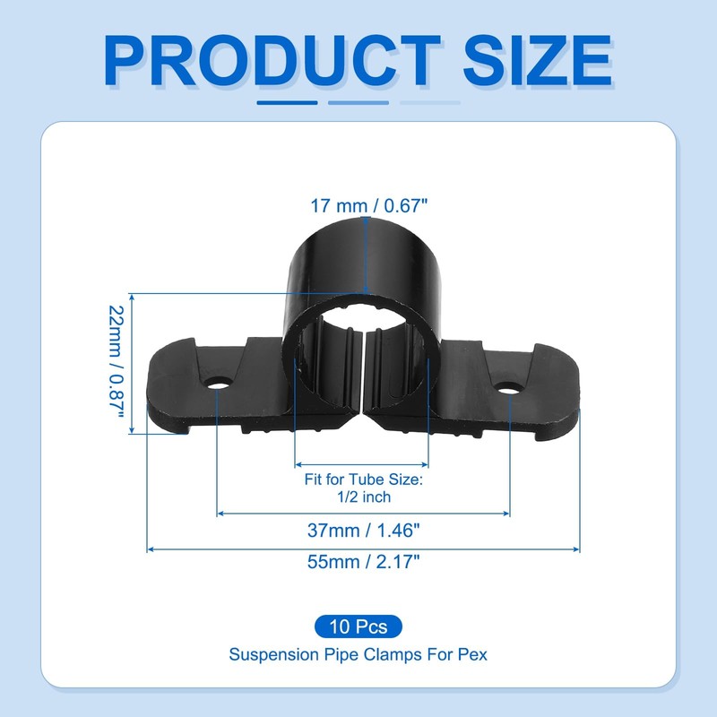 - Fit for Tube Size: 1/2 inch; Overall Size: 55 x 17 x 22 mm / 2.17 x 0.67 x 0.87 inch(L x W x H); Mounting Hole Diameter: 3.5 mm / 0.14 inch; Mounting Hole Distance: 37mm / 1.46 inch; Package List: 10 Pcs x Suspension Pipe Clamps For Pex
