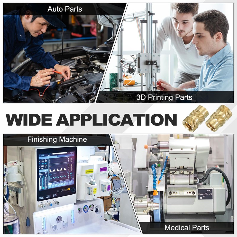 Brass Knurled Nuts can be used for all thermoplastic, including PLA, PETG, ABS, PP, etc. They are widely used in 3D-printed objects, injection-molded plastic parts, automotive plastic housings, laptop housings, circuit board assembly, and electronics.