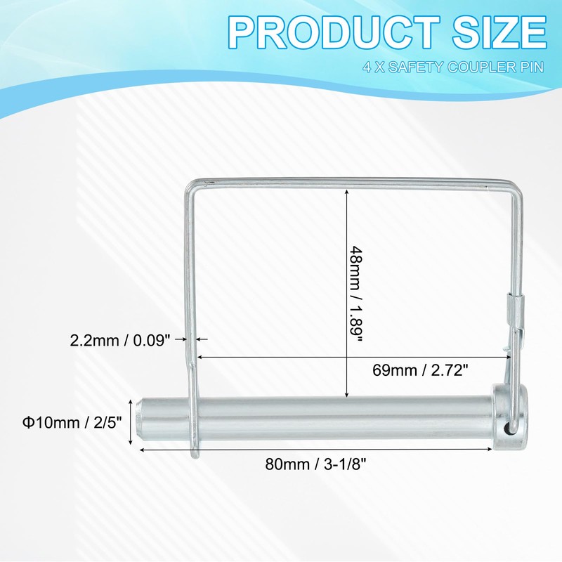 - Pins Diameter: 10 mm / 2/5"; Pins Length: 80 mm / 3-1/8"; Coil Diameter: 2.2 mm / 0.09"; Packing List: 4 x Safety Coupler Pin (NOTE: Please confirm the size before placing an order.)