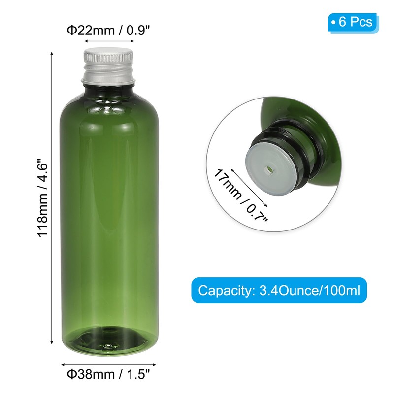• Specification: Material: PET(Body); Aluminum(Cap); Capacity: 3.4 Ounce/100 ml; Color: Silver Tone/Green; Overall Size: 118 x 38mm/4.6 x 1.5 Inch(H*OD); Bottle Cap Outer Diameter: 22mm/0.9 Inch; Bottle Mouth Outer Diameter: 17mm/0.7 Inch; Inner Plug Diameter: 14mm/0.6 Inch; Packing List: 6 Pcs x Travel Bottles