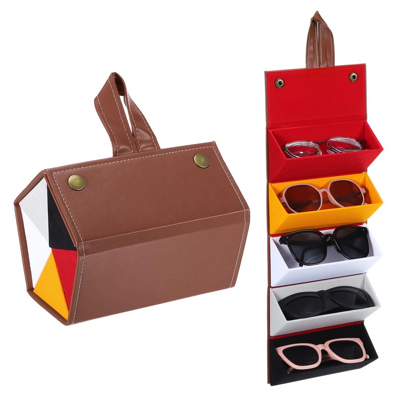 - Advantage: Featuring a 5-slot compartment and folding design, this travel sunglasses organizer is easy to store in drawers or suitcases to save space. When opened, it maximizes storage capacity for your convenience. This sunglasses travel case boasts a hard PU leather outer layer and soft flocking inner layer. It is sturdy, and resistant to extrusion will protect the contents from damage, and prevent lens friction damage. The copper snap buckle ensures secure and easy fastening.