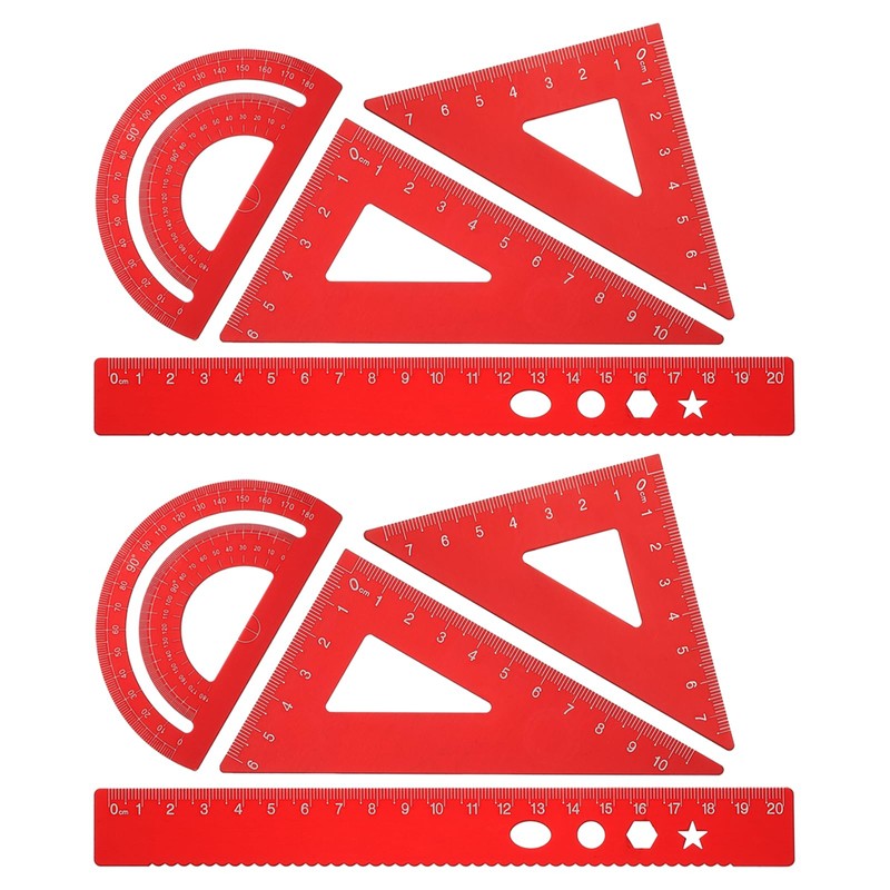 • Specification: Color: Red, Material: Aluminum Alloy, Size: Ruler measure 8"/21cm Length, 1"/2.3cm Width. 45°triangular ruler measure 5"/12cm Length, and 60°triangular ruler measure 5.5"/14cm Length, Package List: 2 x 20cm Ruler, 2 x 45°Triangle Ruler, 2 x 60°Triangle Ruler, 2 x Protractor, Total 8 in one set..