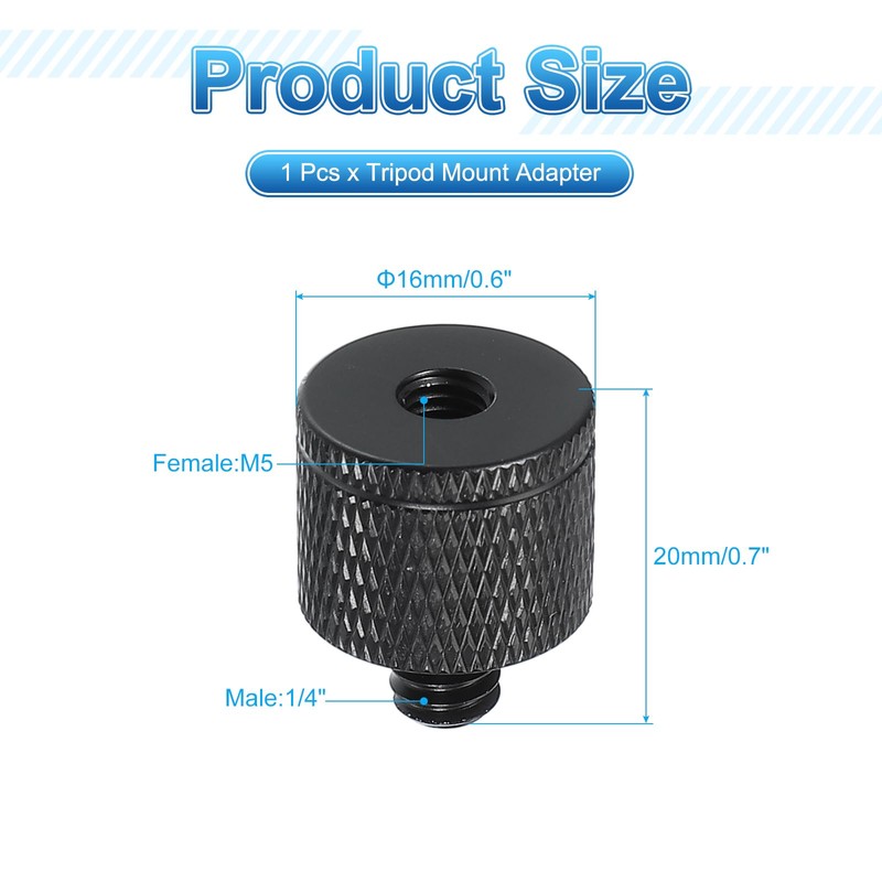 - Size: 16 x 16 x 20 mm / 0.6 x 0.6 x 0.7 Inch (L*W*H); Thread Size: M5 Female to 1/4 Inch Male; Packing List: 1 Pcs x Tripod Mount Adapter
