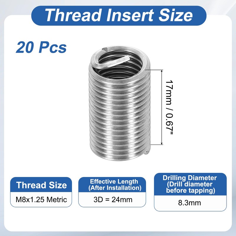 - Thread Size: M8x1.25 Metric; Effective Length (After Installation): 3D = 24mm; Drilling Diameter (Drill diameter before tapping): 8.3mm; Material: 304 Stainless Steel; Color: Silver Tone; Packing List: 20Pcs x Wire Screw Sleeves. Crafted from 304 stainless steel, the thread insert boasts exceptional hardness, good corrosion, rust and oxidation resistance, ensuring long-lasting usage.