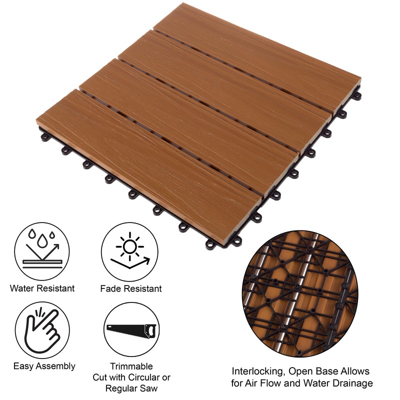 - STURDY COMPOSITE MATERIAL – Made of a wood and plastic composite with a realistic woodgrain texture, the patio tiles don’t require staining or sanding, ensuring this stylish outdoor patio flooring will last season after season.
