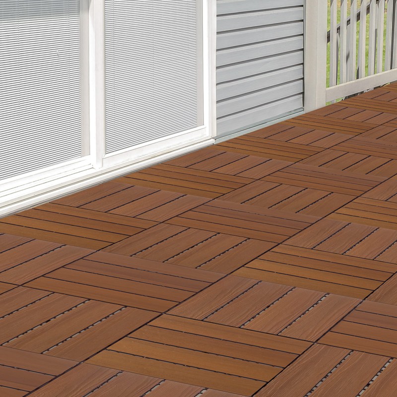 - PRODUCT DETAILS - Materials: Composite Wood and PE Plastic. Dimensions: (L) 11.63" x (W) 11.63" x (H) .88"; Coverage Area: 5.8-square-feet (35.25” x 23.25”). Includes: 6 Outdoor Floor Tiles Per Carton. Color: Brown Woodgrain Look.