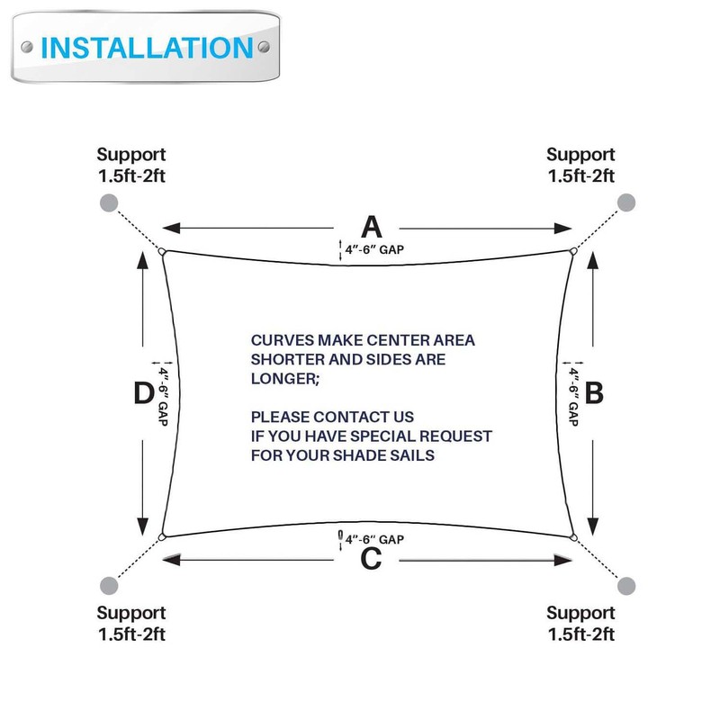 - Installation: Measurement is taken from D ring to D ring, leaving 1.5 - 2 foot space for the hardware kit between shade sail D ring and mounting points. Patio Paradise hardware kits and cables are strongly recommended for best performance and appearance.