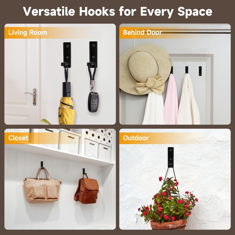 - VERSATILE USE: Perfect for bathrooms, bedrooms, kitchens, living rooms, and entries, these heavy-duty coat hooks are ideal for hanging coats, scarves, jackets, backpacks, towels, and keys.