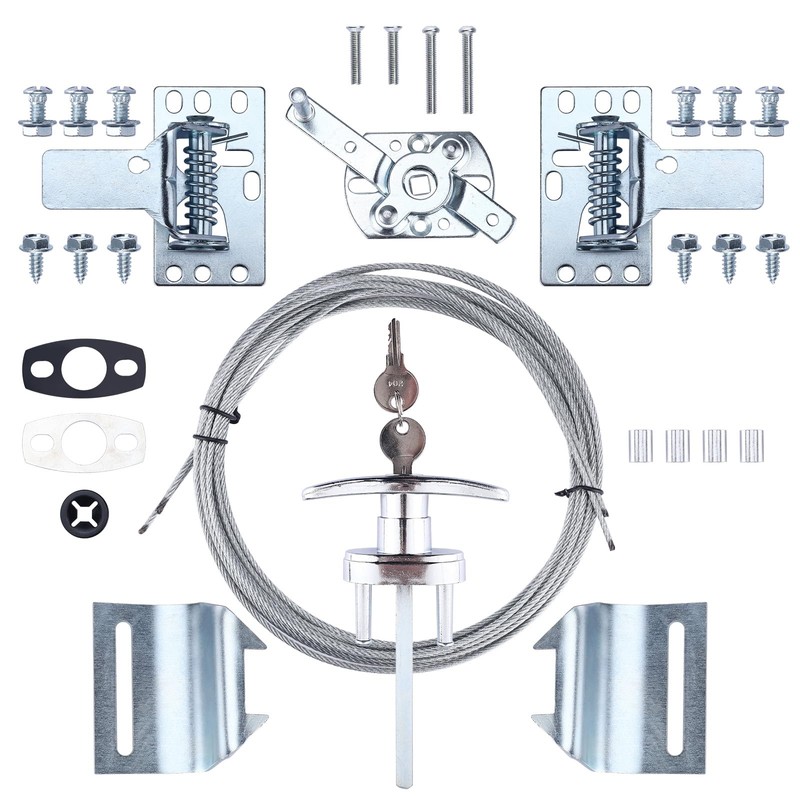 - PACKAGE INCLUDES: Installation Instruction, two 9-foot security cables, lock cylinder with t-handle, internal release lever, spring latches, striker plates, screws and fasteners that needed.