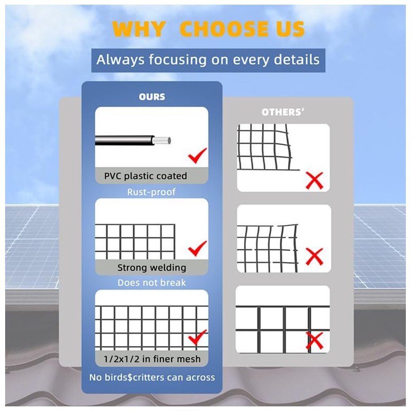 - 1.Solar Panel Bird Wire with Finer Mesh-½ inch x ½ inch mesh, unlike the larger ¾ inch x ¾ inch of other brands. birds and small animals cannot enter to build their nests under the solar panels, while leaving room for air flow to the solar panels.