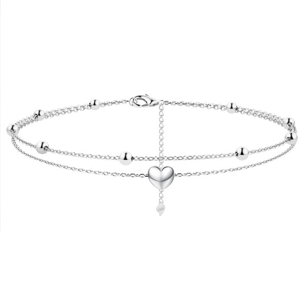 PATISORNA Anklet for Women 925 Sterling Silver Ankle Bracelet 18K White Gold Plated Heart Beads Layer Ankle Bracelet Ajustable Foot Ankle Bracelet Beach Jewelry