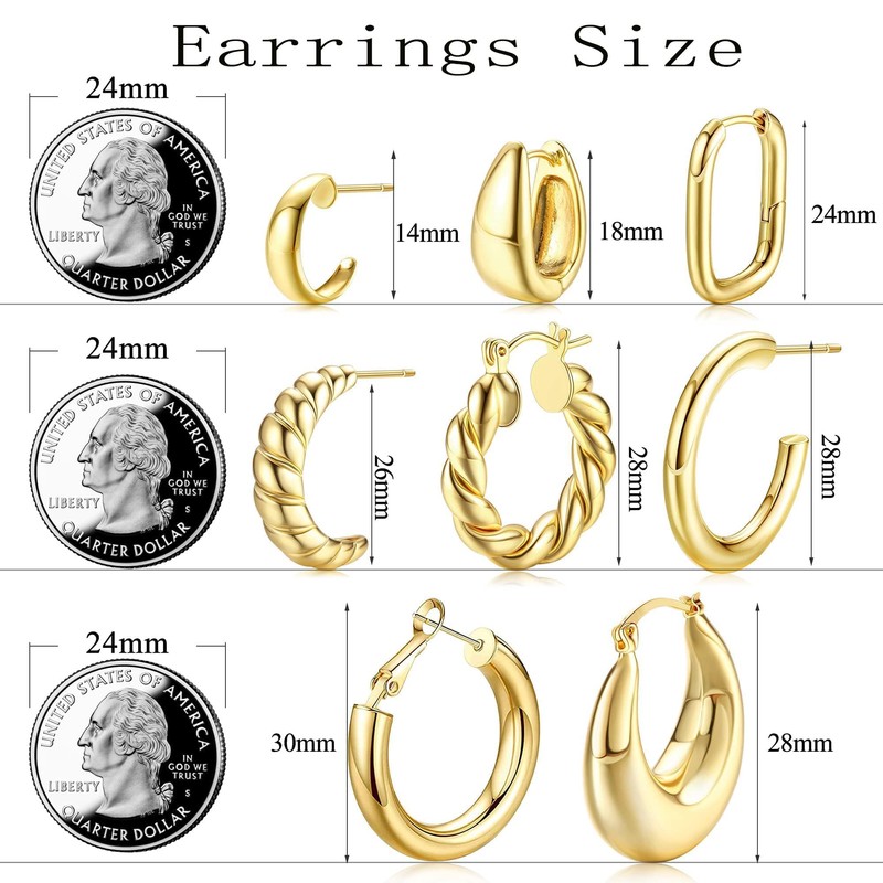 - Trendy Gold Hoop Earrings Set: You will get 8 pairs of gold earrings of different designs come with gold chunky hoops, twist hoop earrings,croissants, tube, etc.The hoops all look very trendy and fancy.You can wear it alone or wear several together.One set can meet your various occasions and wearing needs. Make you more elegant and attractive
