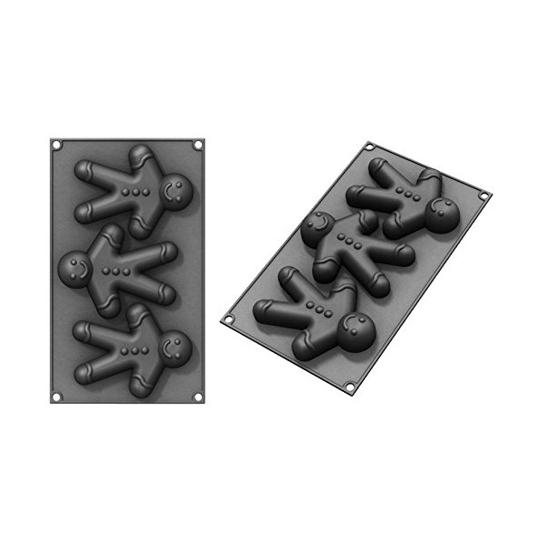 Moule 3 mini bonhommes / maneles -Sa composition à base de silicone et de particules métalliques enrobées permet d'obtenir un résultat de cuisson doré et croustillant - Peut être utilisé pour faire des bonhommes en chocolate - Compatible four, micron-ondes et congélateur - Résiste de - 40°C à +260°C - Net yage à la main et lave vaisselle - Dimensions 30 x 17.5 cm.