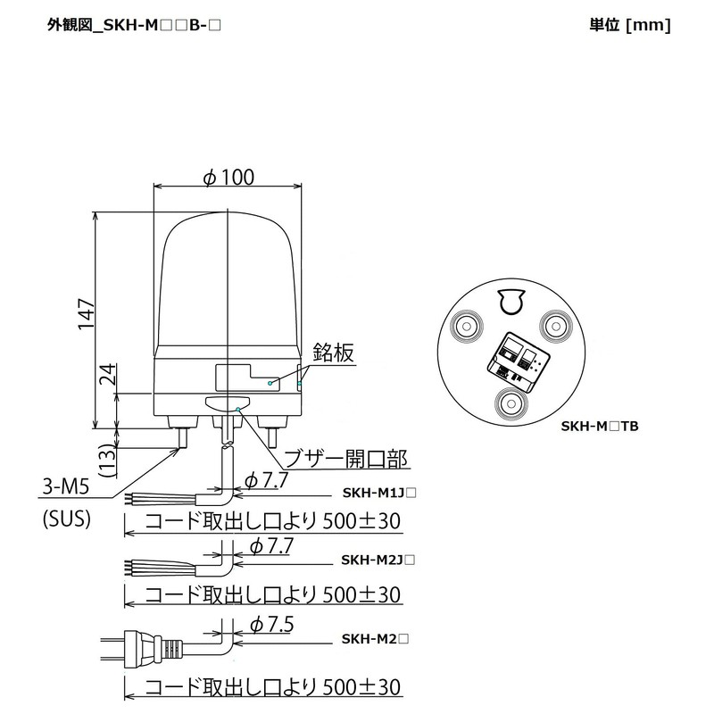 PATLITE SKH-M1JB-Y Rotating Light, Φ100 DC12-24V, Yellow, Buzzer, 3-Point Bolt Foot Mount