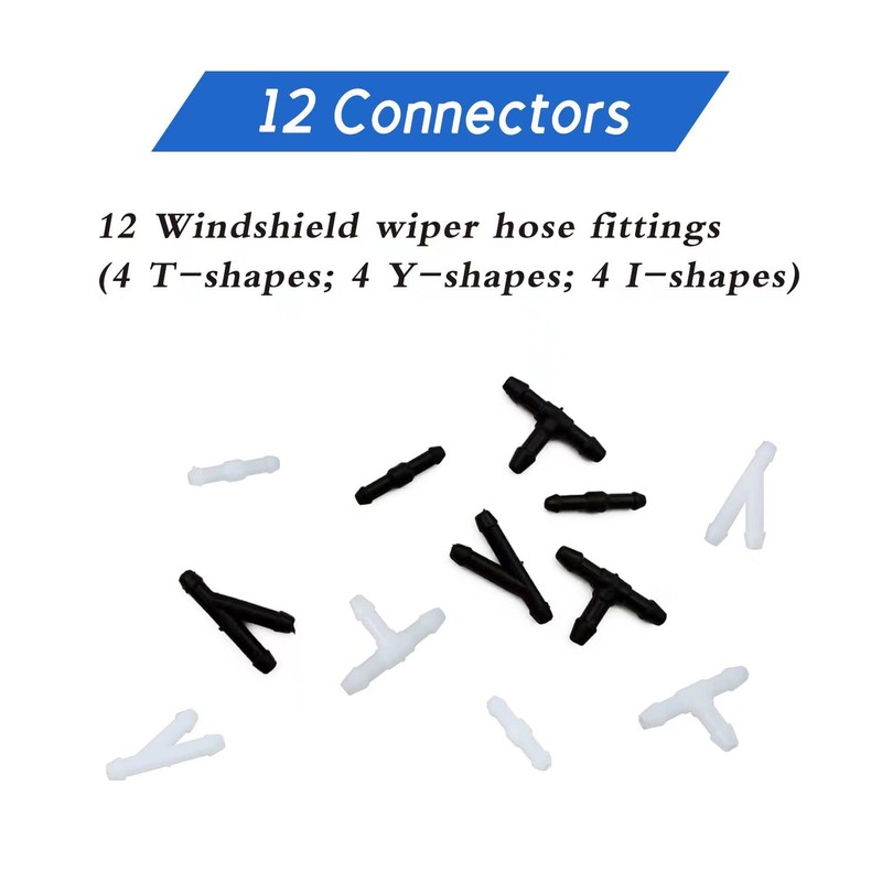 - PACKAGE INCLUDES: 1 x 4M windshield washer hose, 12 x windshield wiper hose connectors (4 x T type; 4 x Y type; 4 x I type).