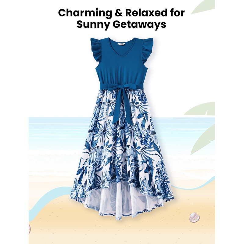 PATPAT Mommy and Me Outfits: Mother Daughter Dresses Couples Matching Sets - Tropical Holiday Floral Print Ruffle Sleeve Sundress Summer Beach Dress Sea Blue Women L