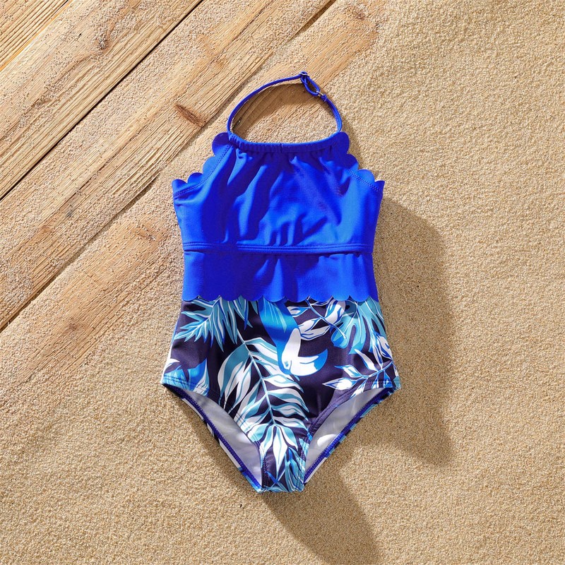 Diseño: correas de hombro ajustables (mujeres/niñas), diseño de cuello halter (niñas), cuello en V (mujeres/niñas), traje de baño de una pieza para mujeres y niñas, traje de baño estampado de hojas para hombres y niños.