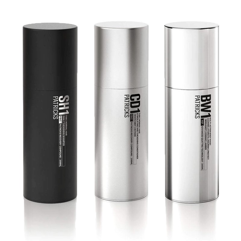 Patricks Daily Thickening Shampoo is a best-selling product specifically formulated for men concerned with or beginning to experience hair loss. Packed with strengthening proteins to help maximize hair density, this shampoo injects strength into your hair from the first wash, making hair appear thicker and fuller without weighing it down. Mild cleansing agents remove excess oil and product build-up, and it is finished with Vetiver and Baltic Amber Cologne. Patricks Stimulating & Thickening Conditioner is fortified with thickening proteins to instantly swell the hair shaft and menthol to gently stimulate the scalp, leaving your hair and scalp nourished. It is finished with White Mint and Vetiver Cologne. Patricks Multi-Action Body Wash washes away dirt, sweat, and pollutants without stripping away moisture. Vitamins A, C + E, antioxidants Dragocalm, actiphyte of Blueberry, and anti-inflammatory super ingredient Green Tea combine to stimulate collagen production and increase cellular rejuvenation for softer, smoother, hydrated skin. Salicylic Acid deeply penetrates pores, making it an effective treatment for breakouts. It is finished with Bergamot, Cognac & Amber Cologne.
