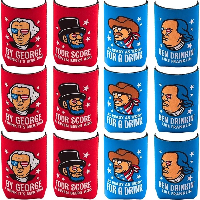 - Each cooler features a cartoon face of a founding father or former president along with a funny saying making these perfect as Fourth of July party favors