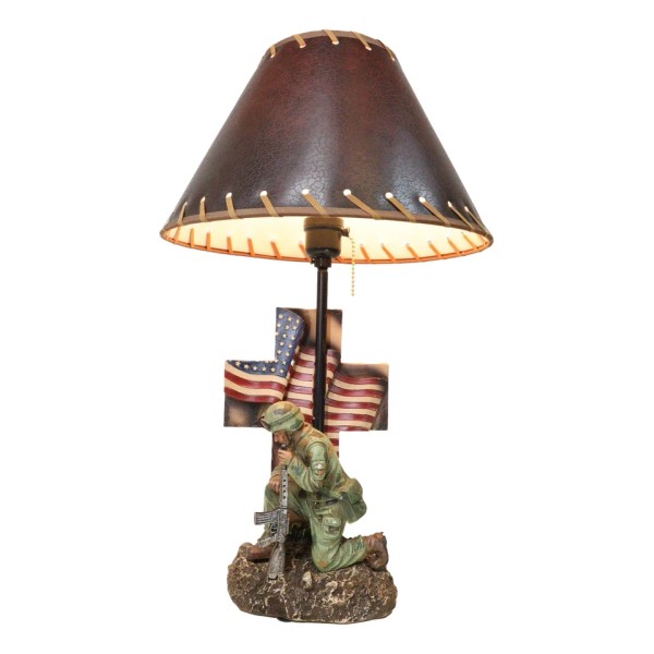 • Let's take a moment of silence in honor of the brave warriors that ensured our freedom. This memorial sculpture features a warrior kneeling by his rifle next to a tall cross decorated with an American flag. This table lamp will fill your room with light as well as proud memories of the fallen heroes who had fought for our freedom.
