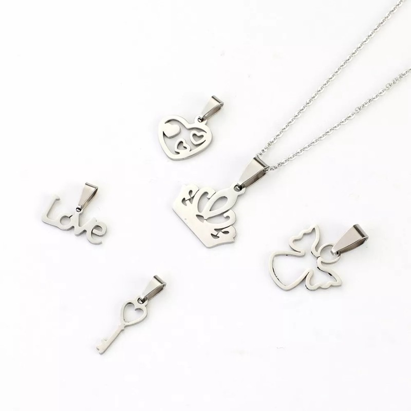 Collar con 5 Dijes intercambiables: Corona, Angel, Llave corazón, Corazón y Love