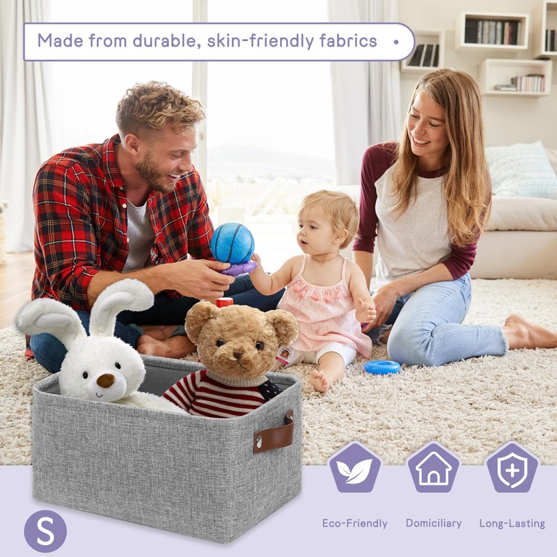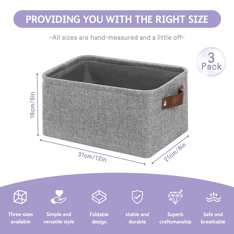 Patvingot Linen Canvas Storage Baskets - Foldable Fabric Boxes with Leather Handles for Cupboards, Storage Boxes for Shelves, for Organizing Clothes, Toys, Office(Grey, Small-3 Pack)