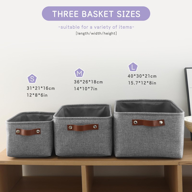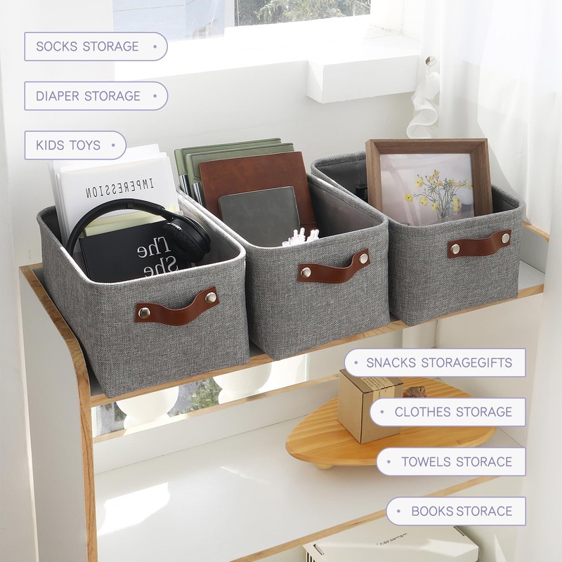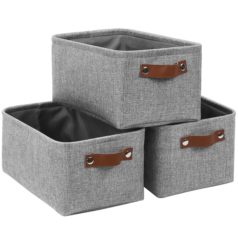 Patvingot Linen Canvas Storage Baskets - Foldable Fabric Boxes with Leather Handles for Cupboards, Storage Boxes for Shelves, for Organizing Clothes, Toys, Office(Grey, Small-3 Pack)